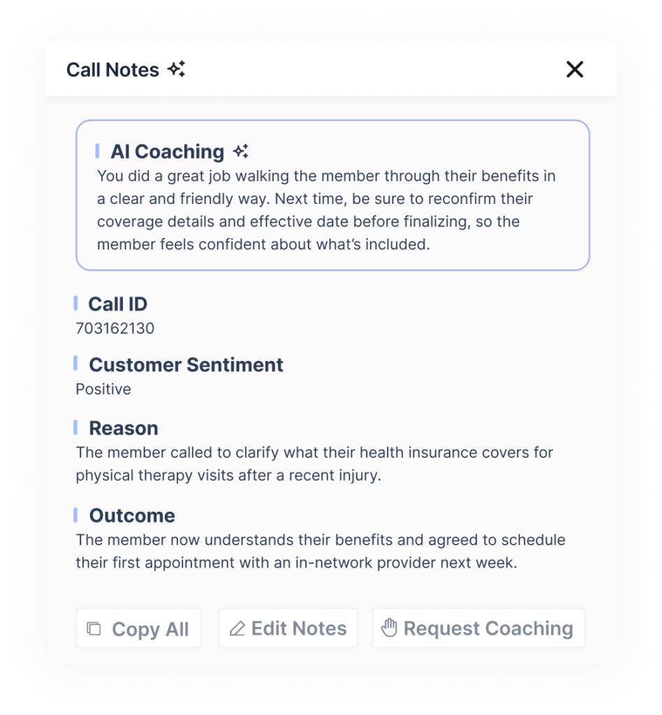 AI coaching recommendations are tailored to individual performance by evaluating behaviors across every conversation and directly linking them to outcomes – so managers know exactly what to reinforce.