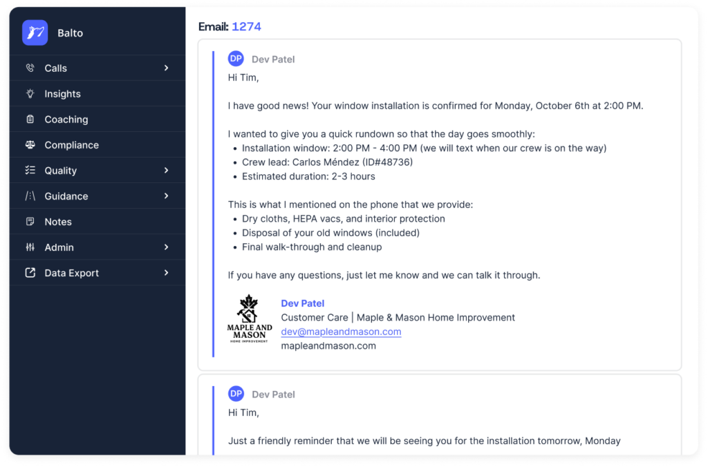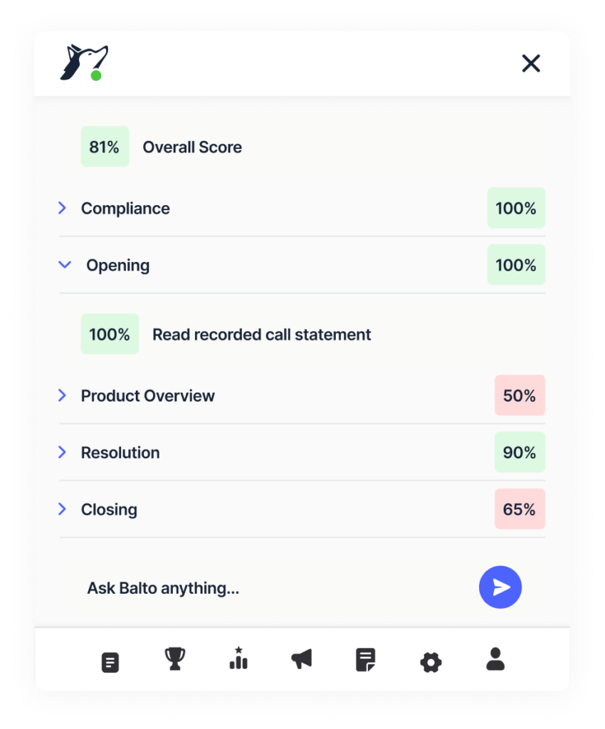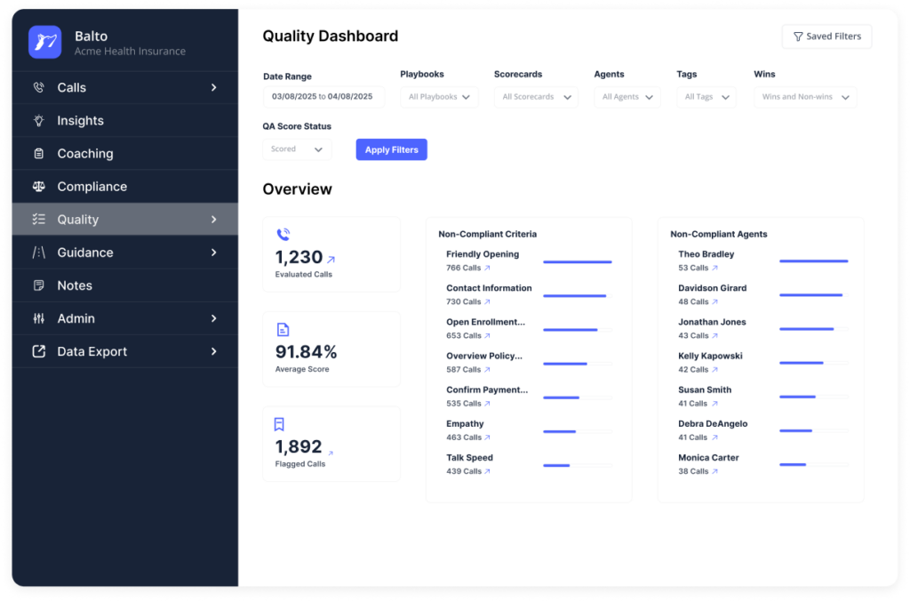 Balto’s AI automatically reviews interactions in real time to identify risk early, alert supervisors, trigger guidance when needed, and maintain a complete audit trail – shifting compliance from reactive review to active control.
