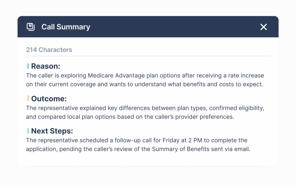 Balto listens to every call–taking notes, scripting disclosures, and tracking important patient information–so your agents can focus on what they do best: caring about your patients.