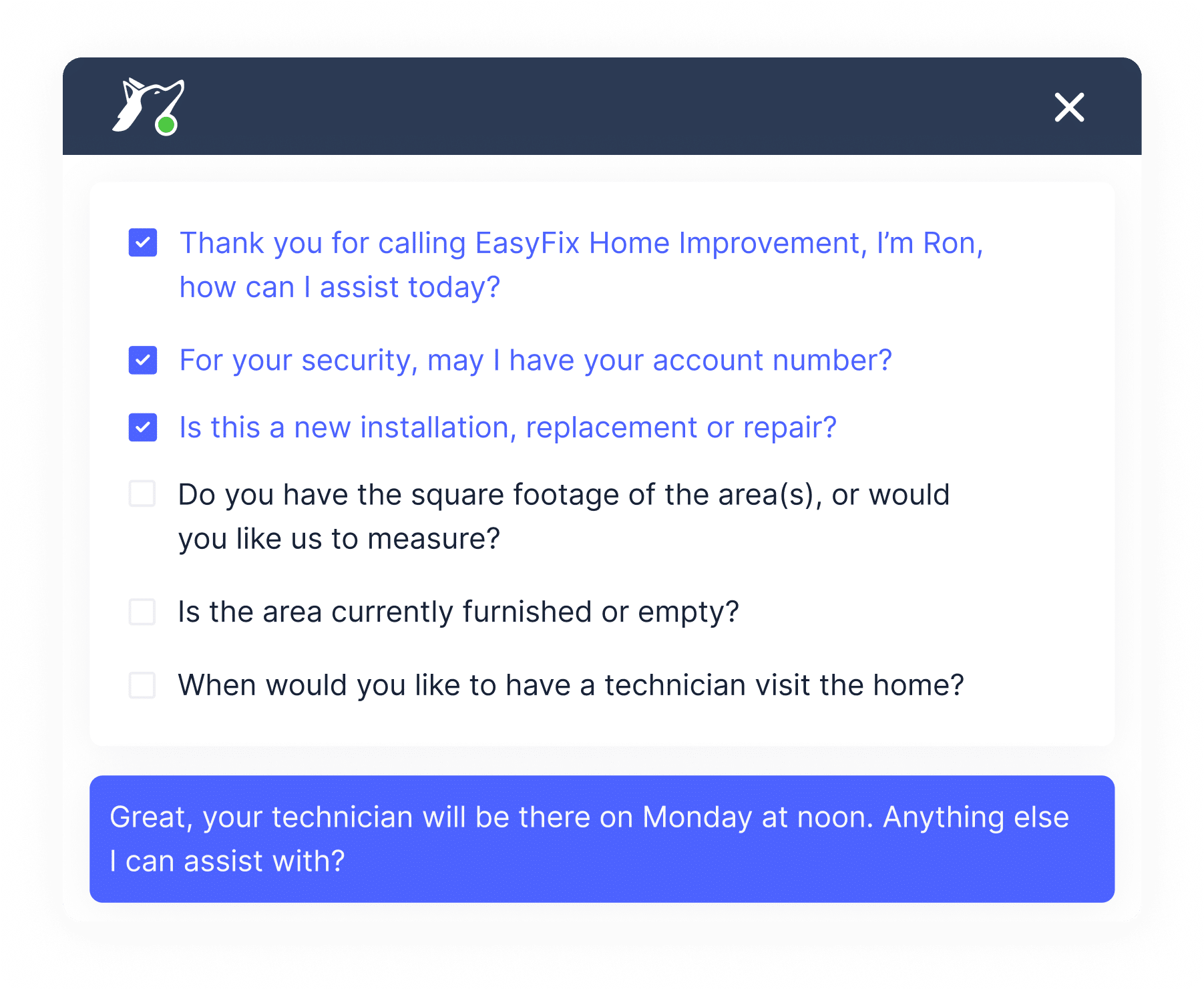 Confirmations: Balto helps reps stick to your core questions, like confirming homeowner information, address details, and appointment date.